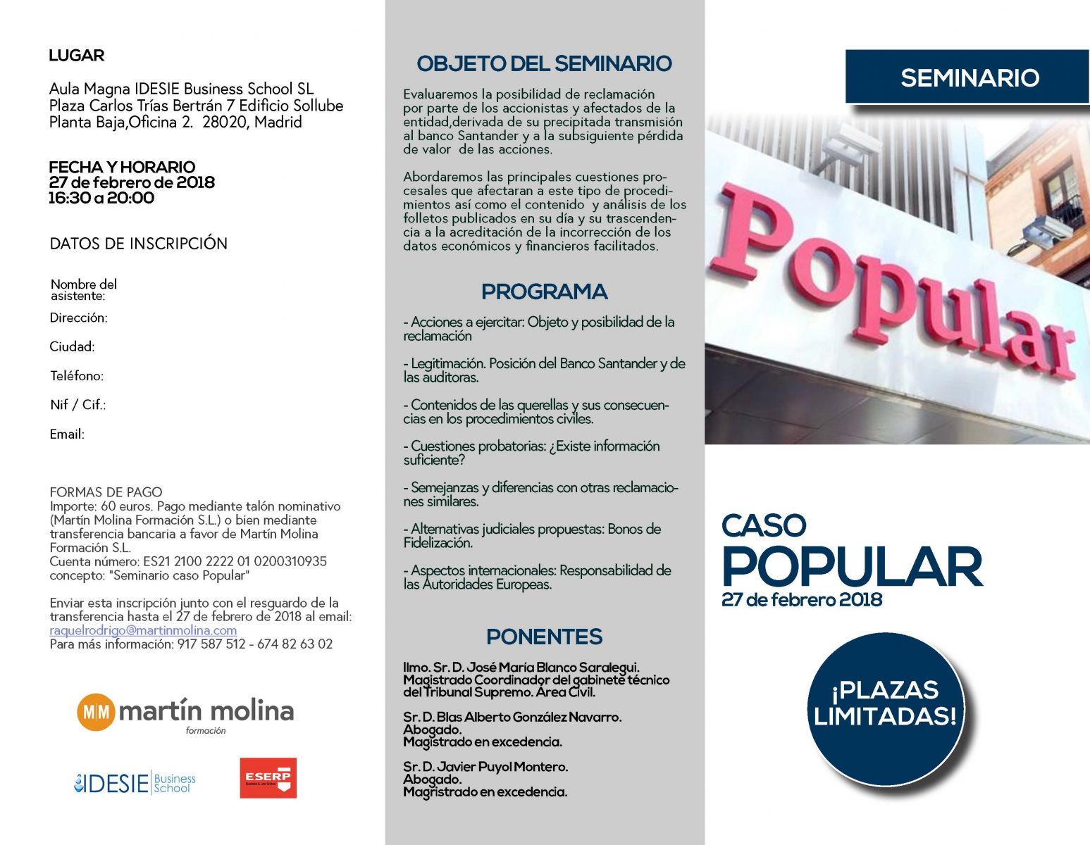 Martín Molina Formación junto con las escuelas de negocios IDESIE y ESERP han organizado un curso de análisis del caso Banco Popular en el que van a participar el Magistrado Coordinador del gabinete técnico del Tribunal Supremo, D. José María Blanco Saralegui; y los Magistrados en excedencia D. Blas Alberto González Navarro y D. Javier Puyol Montero.