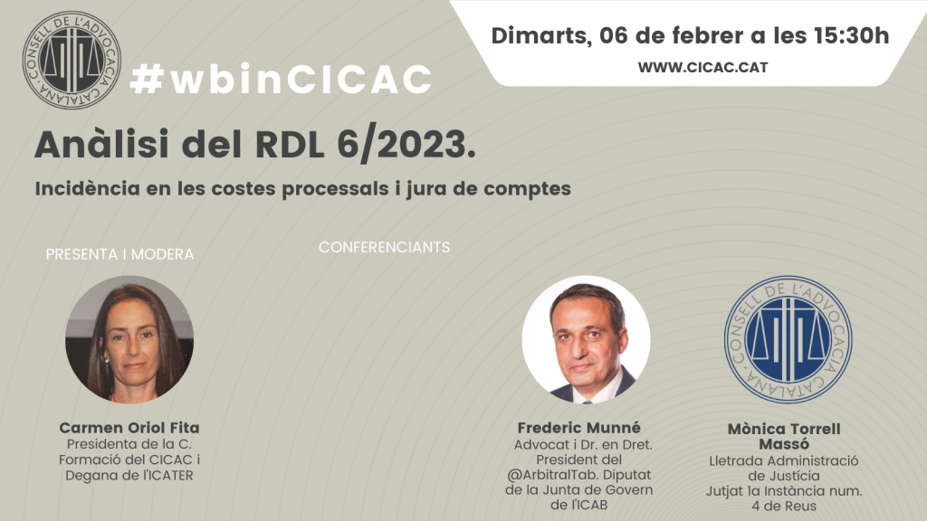 Aquest Consell de l’Advocacia Catalana organitza un cicle de 4 webinars amb l’objectiu d’analitzar el RDL 6/2023, pel qual s’han aprovat mesures urgents per l’execució del pla de recuperació, transformació i resiliència en matèria del servei públic de justícia.